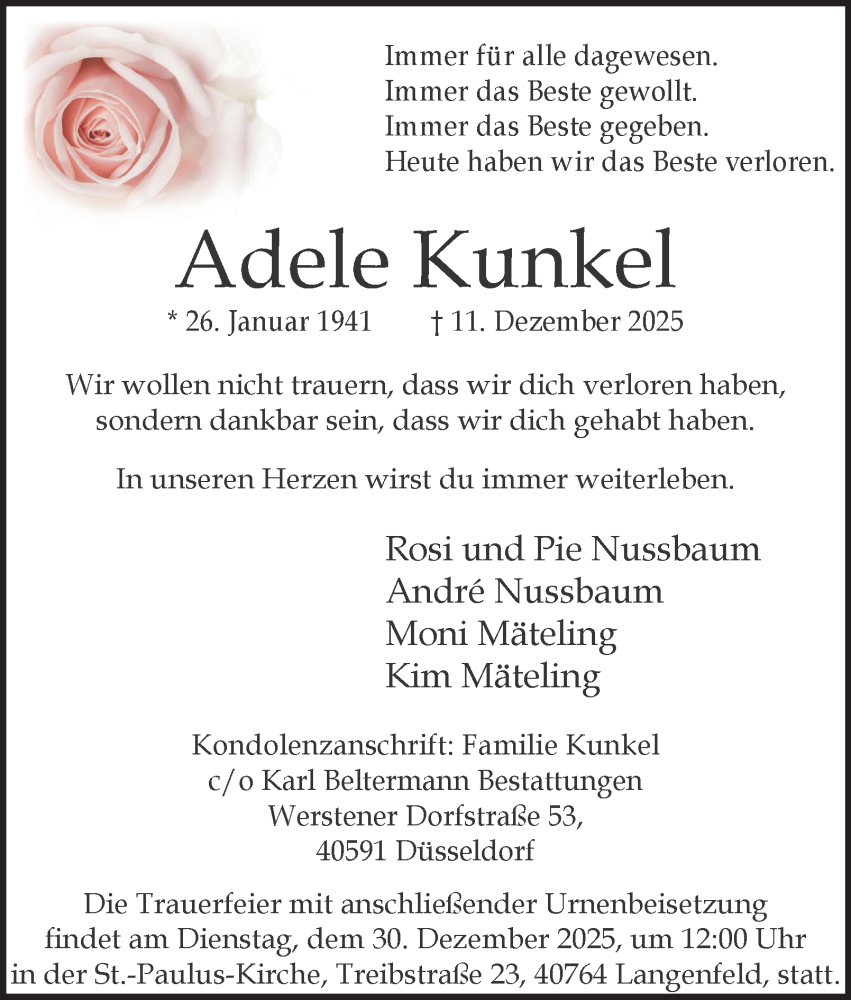Hier finden Sie alle Traueranzeigen aus der Zeitung, die bisher für Adele Kunkel erschienen sind. Weitere Traueranzeigen, die in der Zeitung erscheinen, werden hier ebenfalls aufgelistet