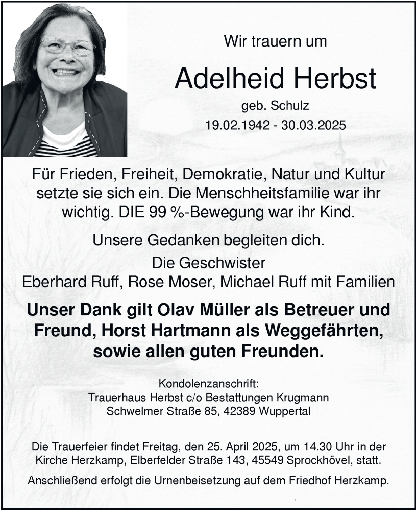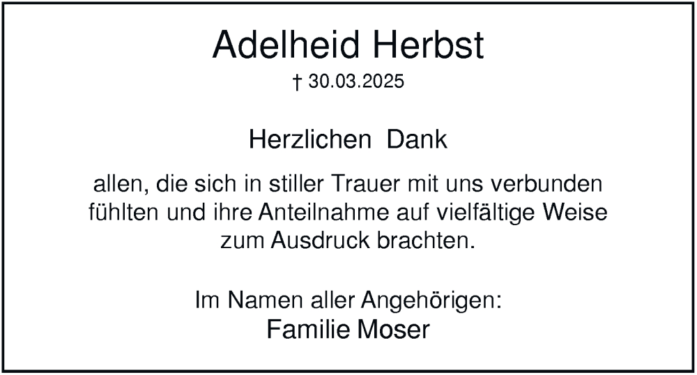 Hier finden Sie alle Traueranzeigen aus der Zeitung, die bisher für Adelheid Herbst erschienen sind. Weitere Traueranzeigen, die in der Zeitung erscheinen, werden hier ebenfalls aufgelistet