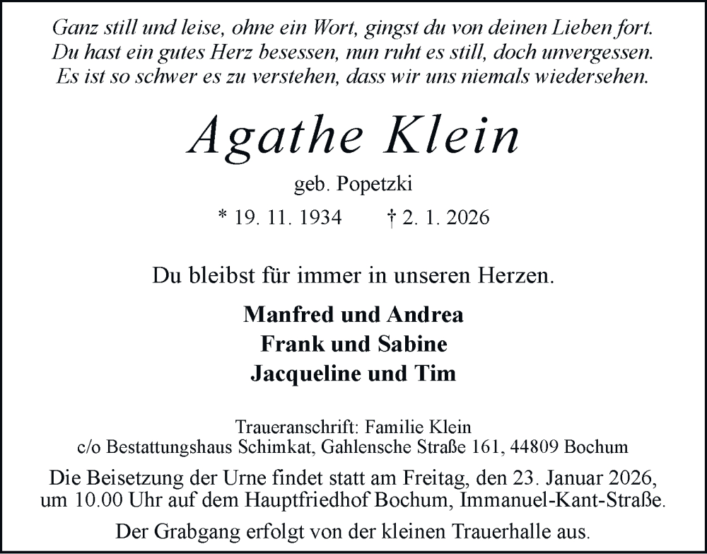 Hier finden Sie alle Traueranzeigen aus der Zeitung, die bisher für Agathe Klein erschienen sind. Weitere Traueranzeigen, die in der Zeitung erscheinen, werden hier ebenfalls aufgelistet