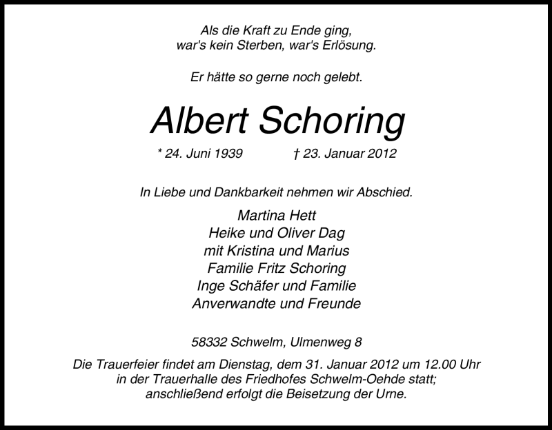 Hier finden Sie alle Traueranzeigen aus der Zeitung, die bisher für Albert Schoring erschienen sind. Weitere Traueranzeigen, die in der Zeitung erscheinen, werden hier ebenfalls aufgelistet