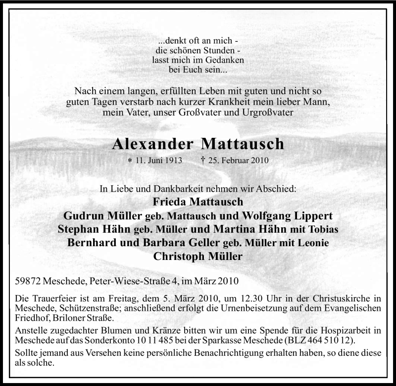 Hier finden Sie alle Traueranzeigen aus der Zeitung, die bisher für Alexander Mattausch erschienen sind. Weitere Traueranzeigen, die in der Zeitung erscheinen, werden hier ebenfalls aufgelistet