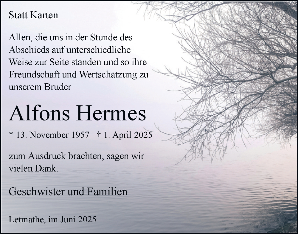 Hier finden Sie alle Traueranzeigen aus der Zeitung, die bisher für Alfons Hermes erschienen sind. Weitere Traueranzeigen, die in der Zeitung erscheinen, werden hier ebenfalls aufgelistet