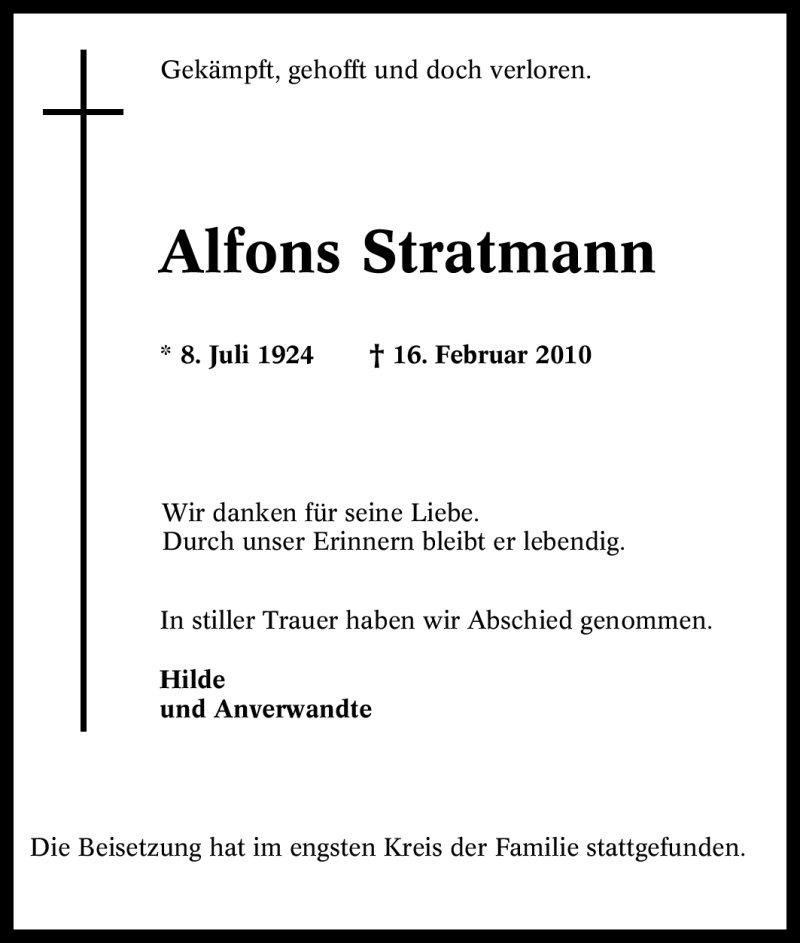 Hier finden Sie alle Traueranzeigen aus der Zeitung, die bisher für Alfons Stratmann erschienen sind. Weitere Traueranzeigen, die in der Zeitung erscheinen, werden hier ebenfalls aufgelistet