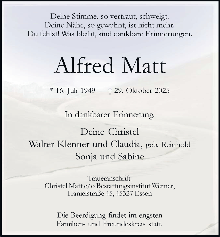 Hier finden Sie alle Traueranzeigen aus der Zeitung, die bisher für Alfred Matt erschienen sind. Weitere Traueranzeigen, die in der Zeitung erscheinen, werden hier ebenfalls aufgelistet