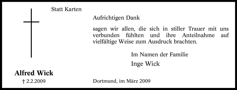 Hier finden Sie alle Traueranzeigen aus der Zeitung, die bisher für Alfred Wick erschienen sind. Weitere Traueranzeigen, die in der Zeitung erscheinen, werden hier ebenfalls aufgelistet