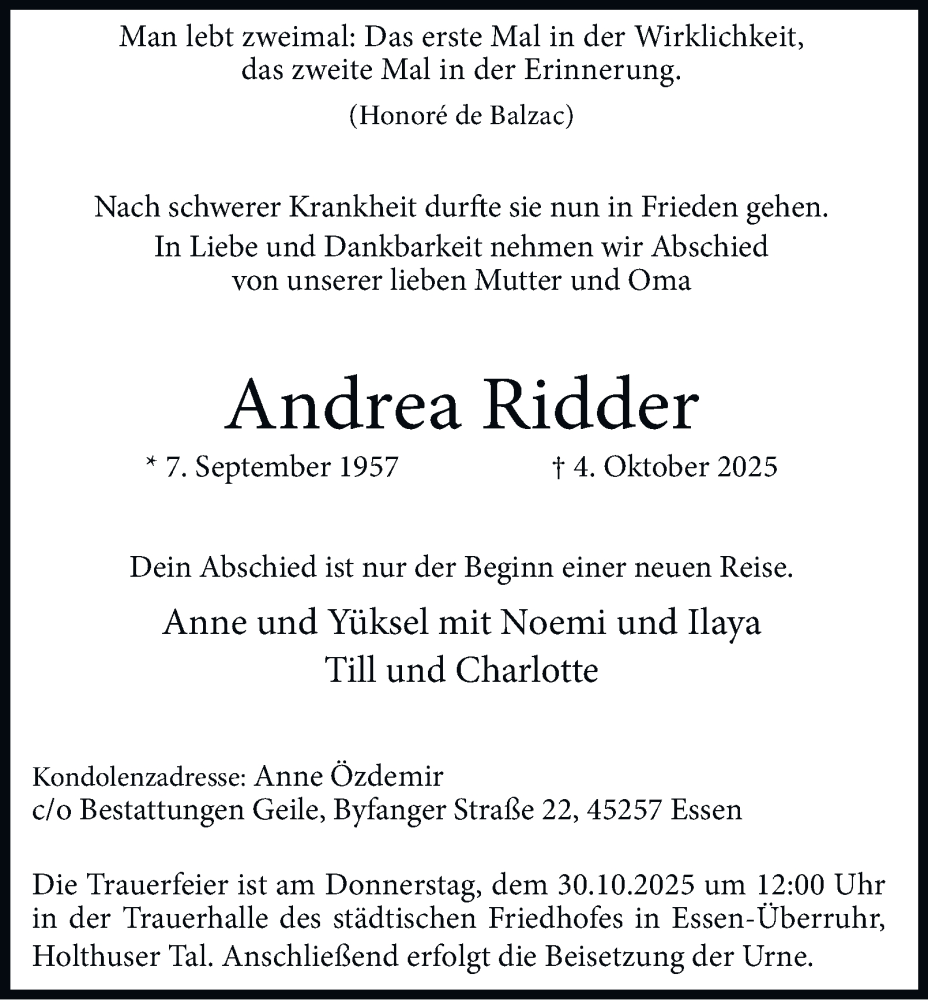 Hier finden Sie alle Traueranzeigen aus der Zeitung, die bisher für Andrea Ridder erschienen sind. Weitere Traueranzeigen, die in der Zeitung erscheinen, werden hier ebenfalls aufgelistet