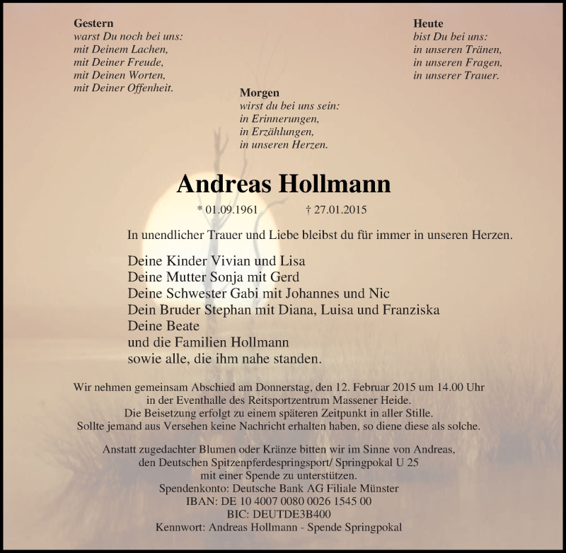 Hier finden Sie alle Traueranzeigen aus der Zeitung, die bisher für Andreas Hollmann erschienen sind. Weitere Traueranzeigen, die in der Zeitung erscheinen, werden hier ebenfalls aufgelistet