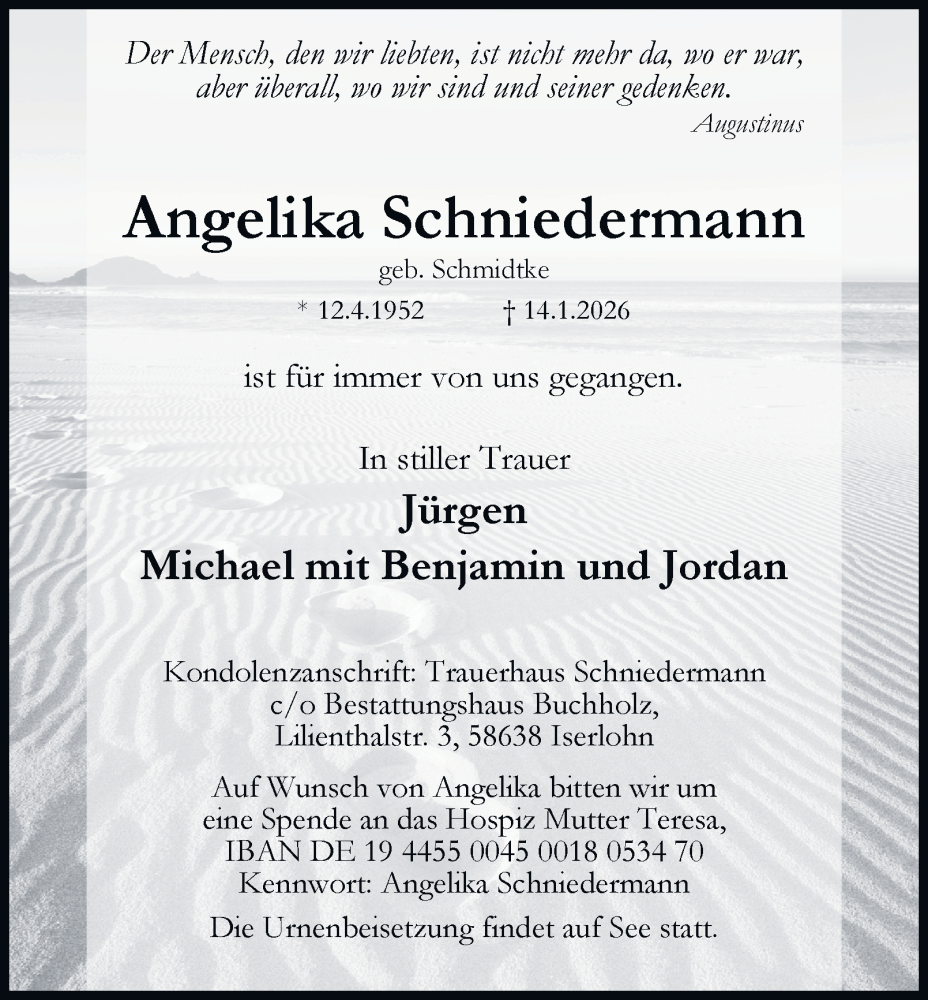 Hier finden Sie alle Traueranzeigen aus der Zeitung, die bisher für Angelika Schniedermann erschienen sind. Weitere Traueranzeigen, die in der Zeitung erscheinen, werden hier ebenfalls aufgelistet