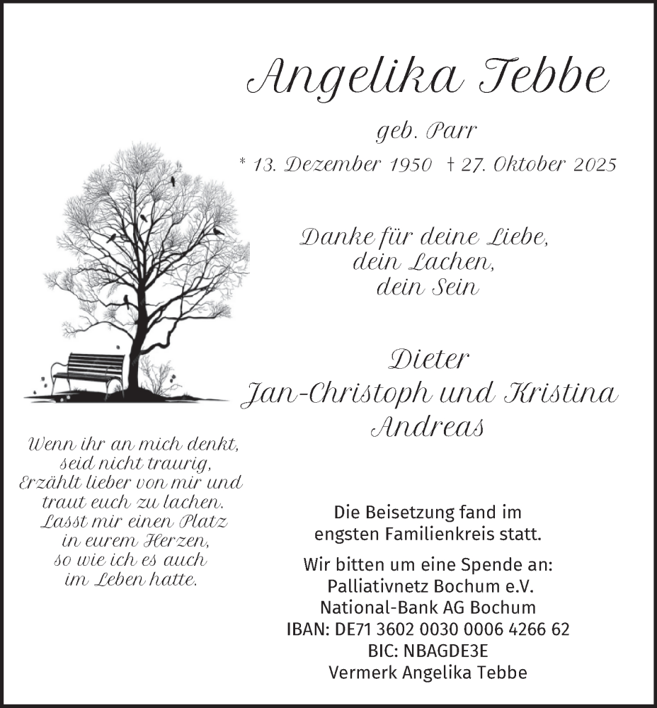 Hier finden Sie alle Traueranzeigen aus der Zeitung, die bisher für Angelika Tebbe erschienen sind. Weitere Traueranzeigen, die in der Zeitung erscheinen, werden hier ebenfalls aufgelistet