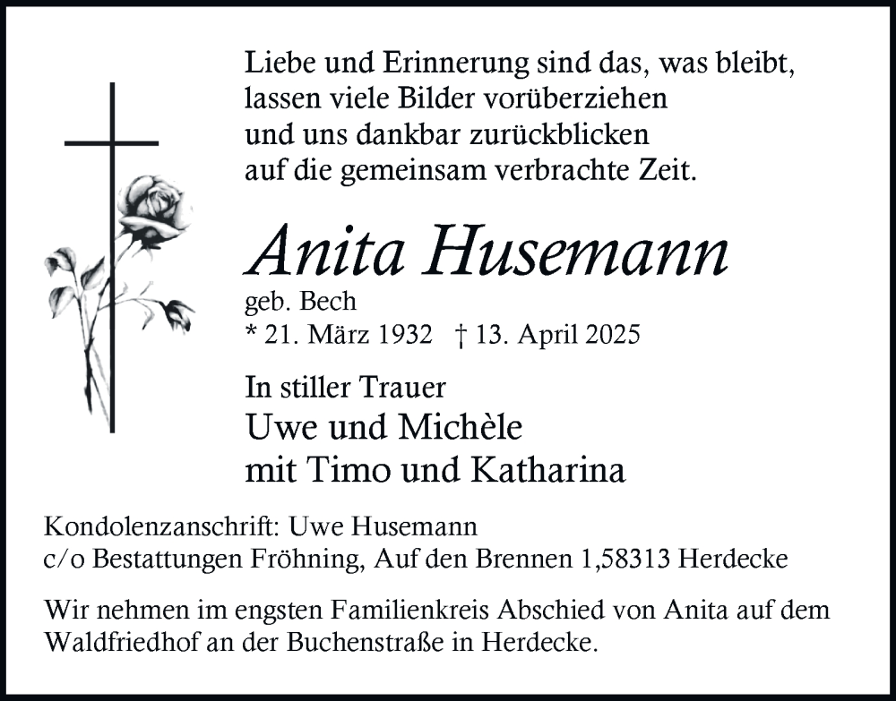 Hier finden Sie alle Traueranzeigen aus der Zeitung, die bisher für Anita Husemann erschienen sind. Weitere Traueranzeigen, die in der Zeitung erscheinen, werden hier ebenfalls aufgelistet