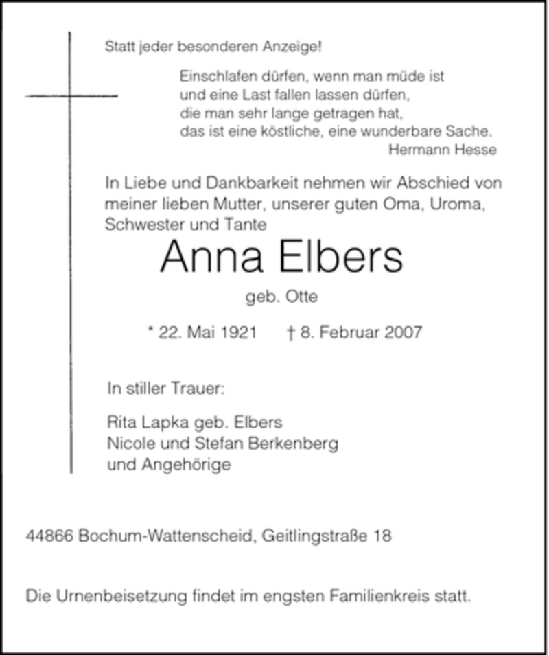 Hier finden Sie alle Traueranzeigen aus der Zeitung, die bisher für Anna Elbers erschienen sind. Weitere Traueranzeigen, die in der Zeitung erscheinen, werden hier ebenfalls aufgelistet