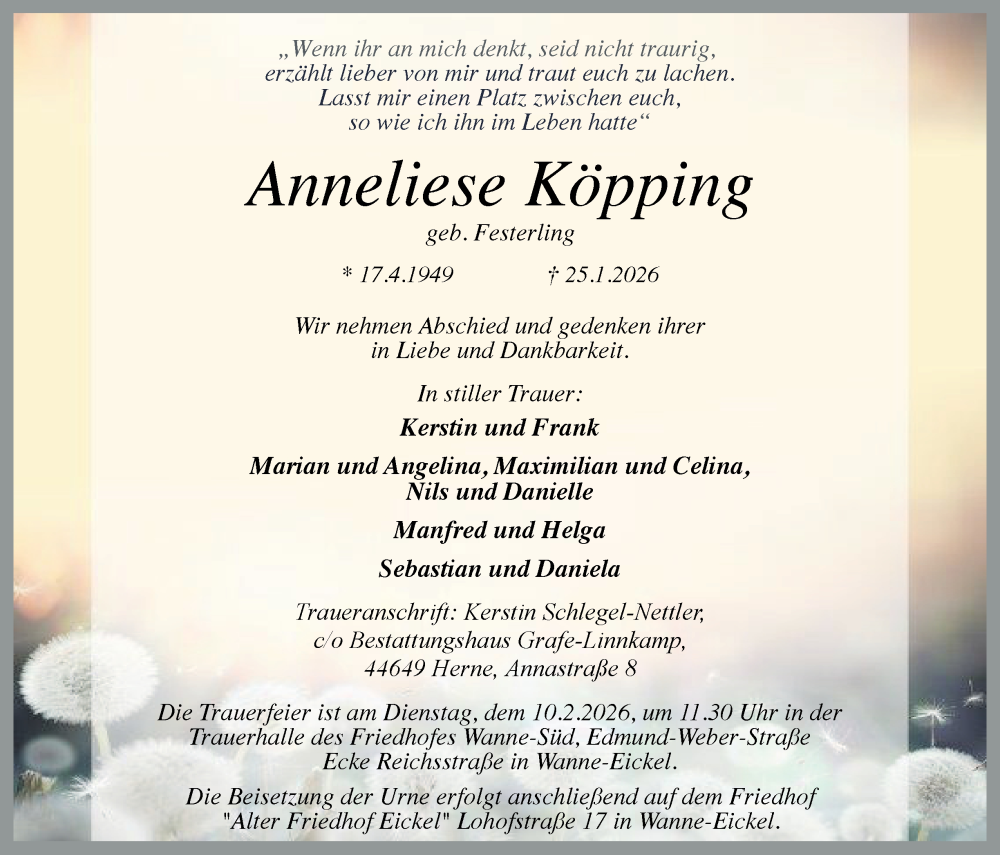 Hier finden Sie alle Traueranzeigen aus der Zeitung, die bisher für Anneliese Köpping erschienen sind. Weitere Traueranzeigen, die in der Zeitung erscheinen, werden hier ebenfalls aufgelistet