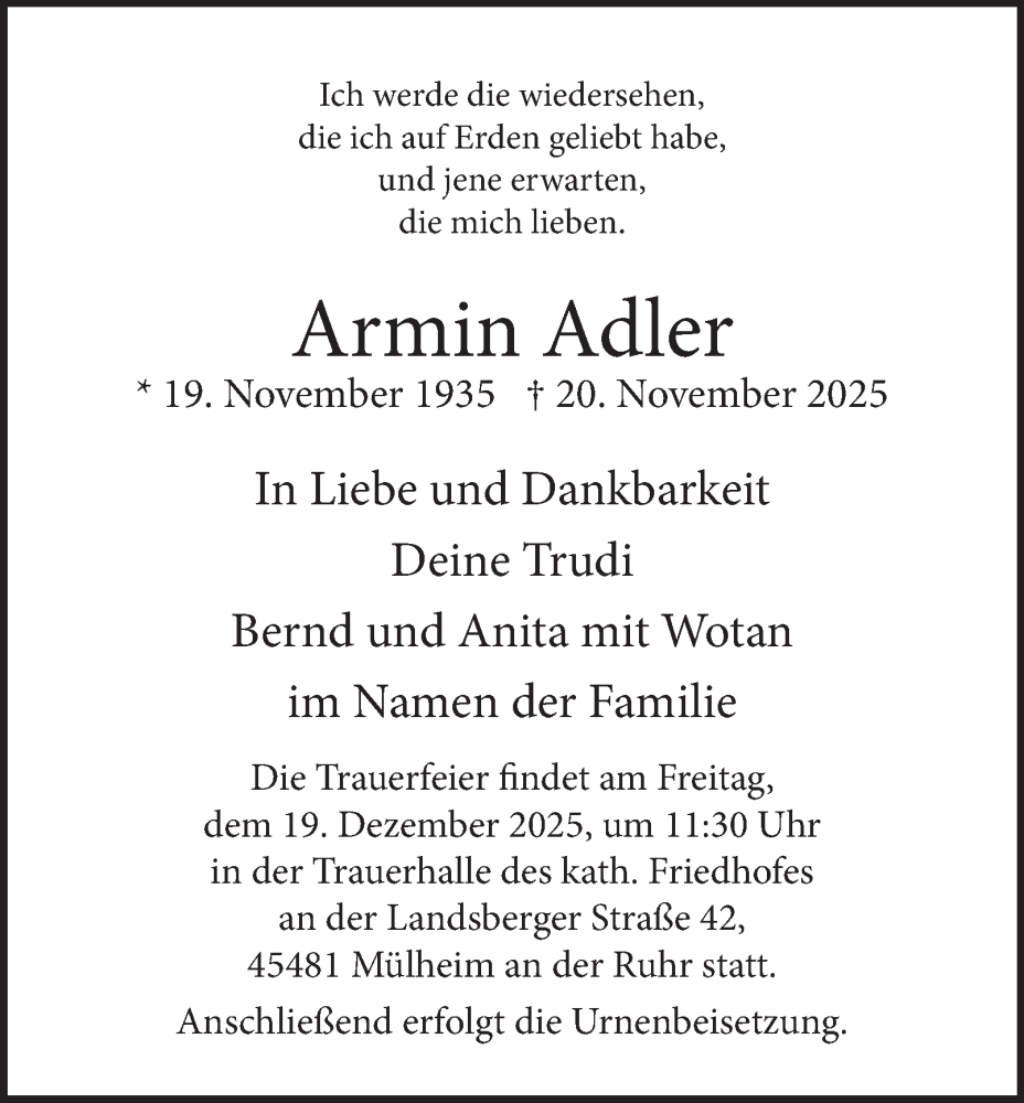 Hier finden Sie alle Traueranzeigen aus der Zeitung, die bisher für Armin Adler erschienen sind. Weitere Traueranzeigen, die in der Zeitung erscheinen, werden hier ebenfalls aufgelistet