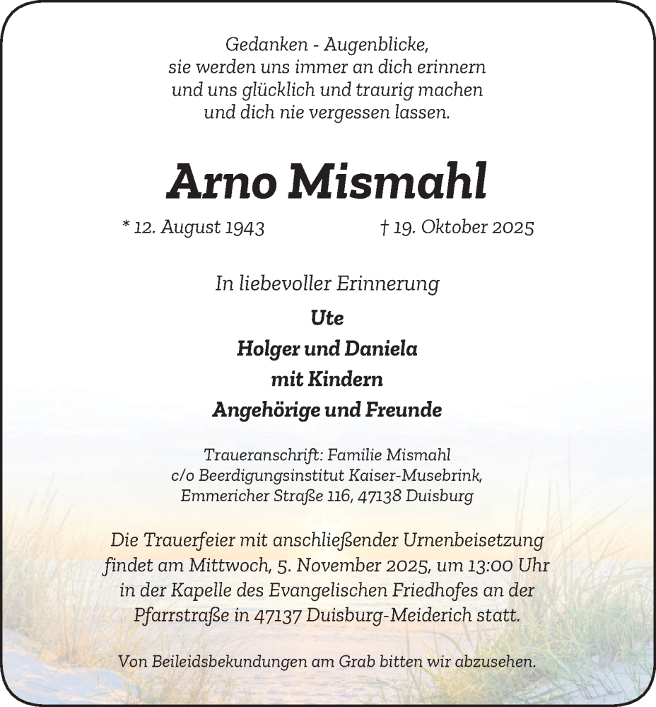 Hier finden Sie alle Traueranzeigen aus der Zeitung, die bisher für Arno Mismahl erschienen sind. Weitere Traueranzeigen, die in der Zeitung erscheinen, werden hier ebenfalls aufgelistet