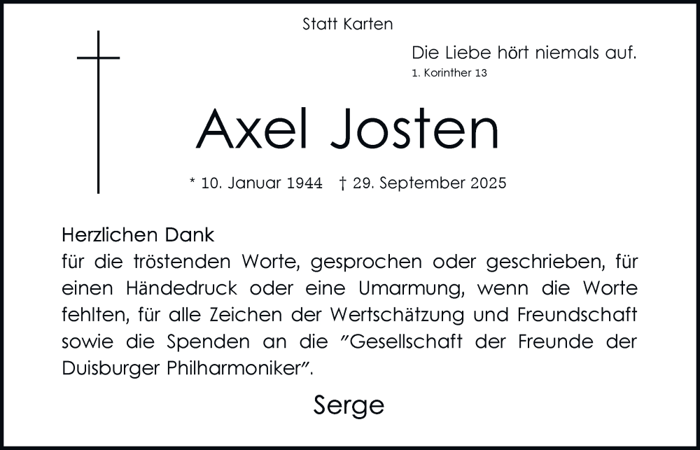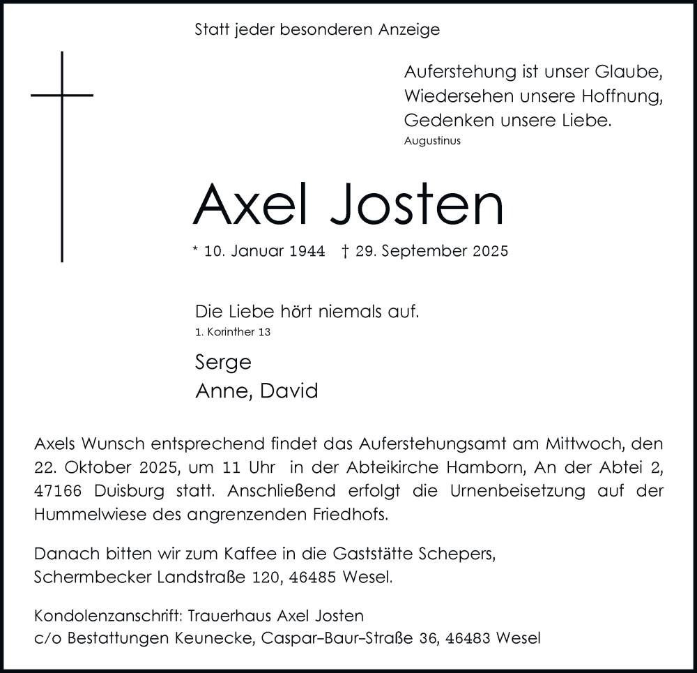 Hier finden Sie alle Traueranzeigen aus der Zeitung, die bisher für Axel Josten erschienen sind. Weitere Traueranzeigen, die in der Zeitung erscheinen, werden hier ebenfalls aufgelistet