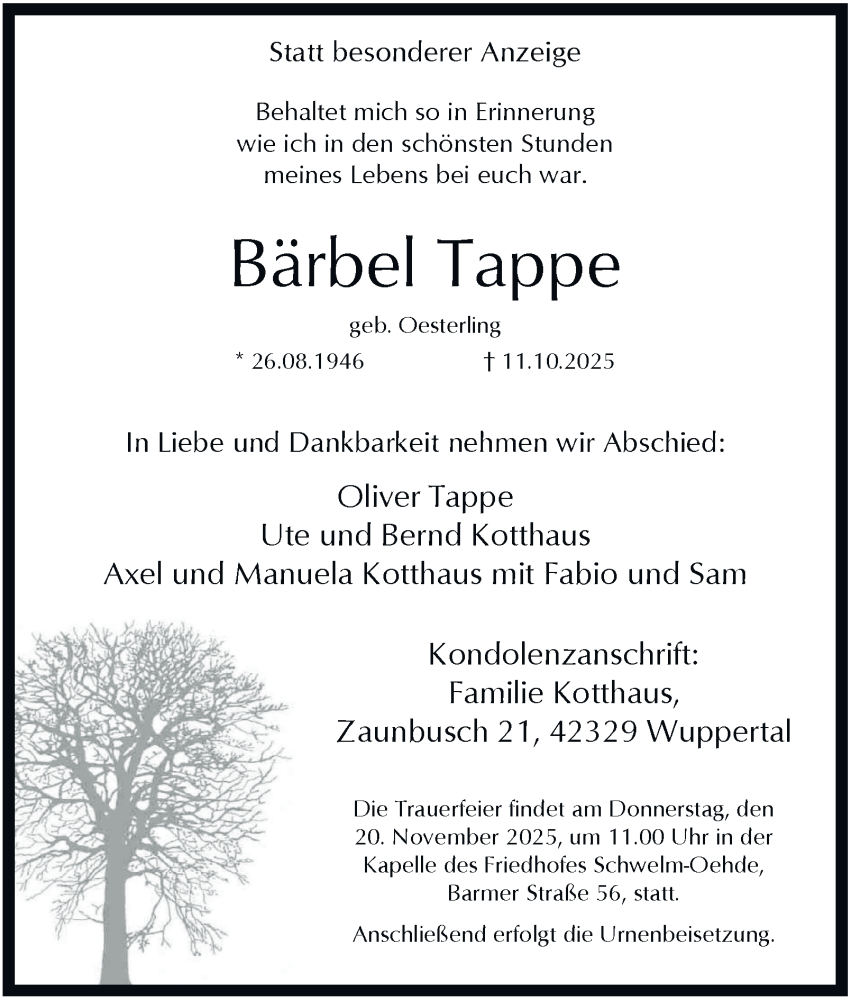 Hier finden Sie alle Traueranzeigen aus der Zeitung, die bisher für Bärbel Tappe erschienen sind. Weitere Traueranzeigen, die in der Zeitung erscheinen, werden hier ebenfalls aufgelistet