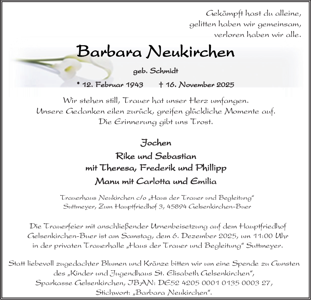 Hier finden Sie alle Traueranzeigen aus der Zeitung, die bisher für Barbara Neukirchen erschienen sind. Weitere Traueranzeigen, die in der Zeitung erscheinen, werden hier ebenfalls aufgelistet