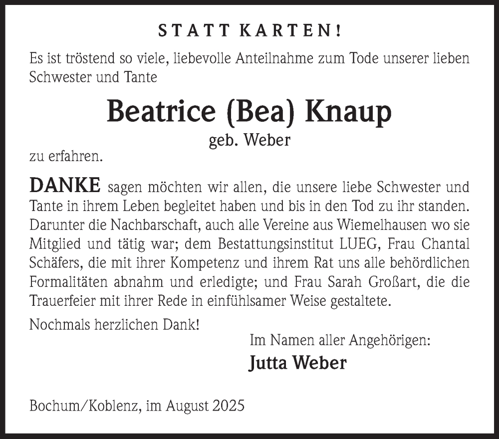 Hier finden Sie alle Traueranzeigen aus der Zeitung, die bisher für Beatrice Knaup erschienen sind. Weitere Traueranzeigen, die in der Zeitung erscheinen, werden hier ebenfalls aufgelistet