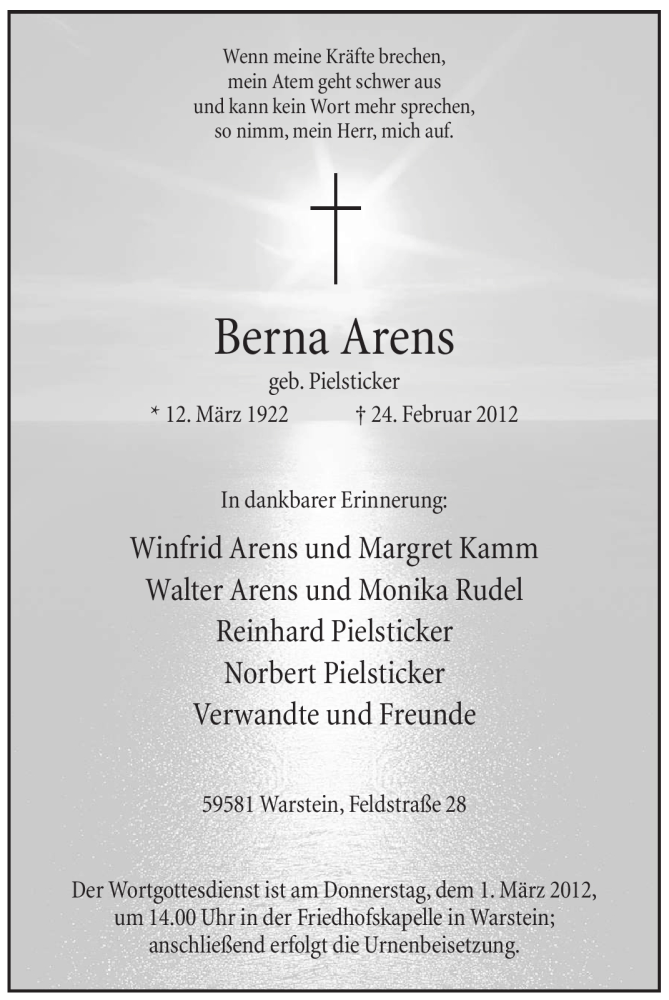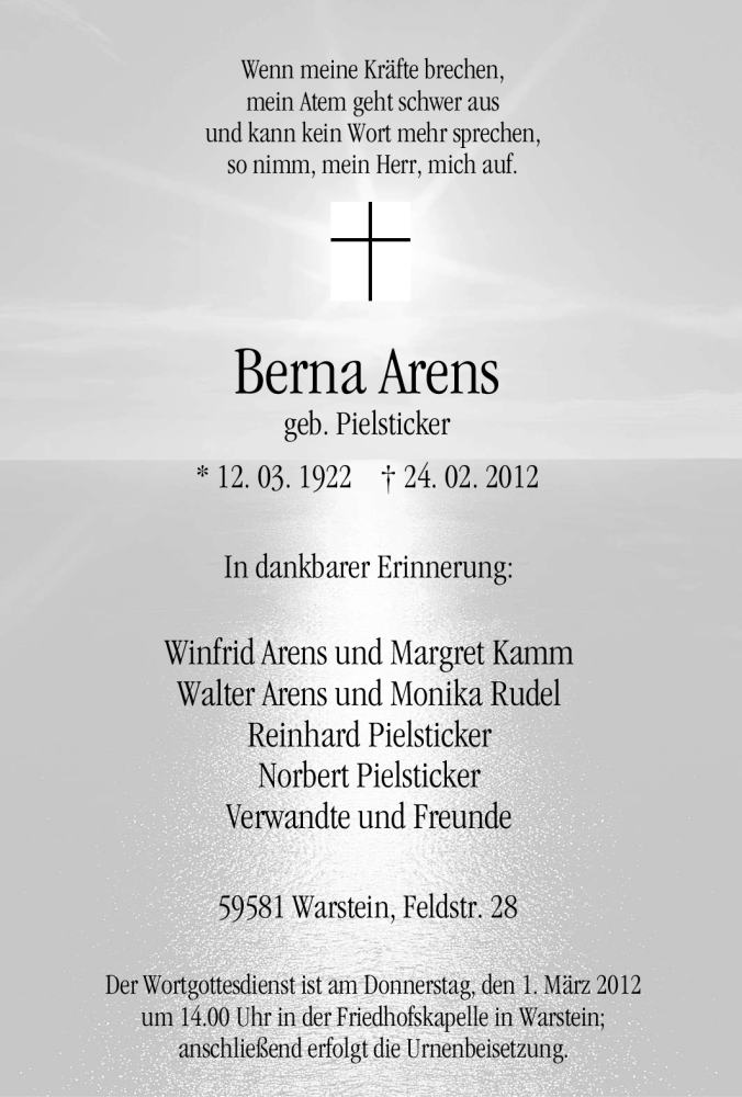 Hier finden Sie alle Traueranzeigen aus der Zeitung, die bisher für Berna Arens erschienen sind. Weitere Traueranzeigen, die in der Zeitung erscheinen, werden hier ebenfalls aufgelistet
