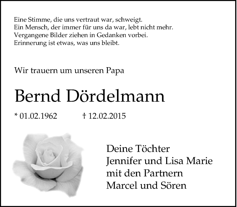Hier finden Sie alle Traueranzeigen aus der Zeitung, die bisher für Bernd Dördelmann erschienen sind. Weitere Traueranzeigen, die in der Zeitung erscheinen, werden hier ebenfalls aufgelistet