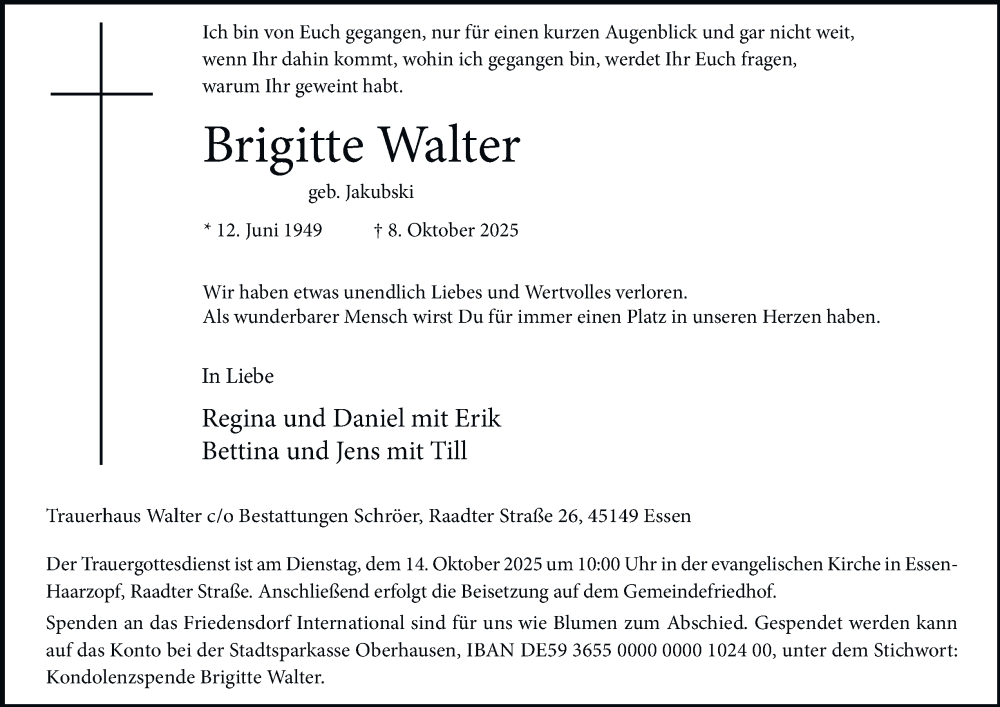 Hier finden Sie alle Traueranzeigen aus der Zeitung, die bisher für Brigitte Walter erschienen sind. Weitere Traueranzeigen, die in der Zeitung erscheinen, werden hier ebenfalls aufgelistet
