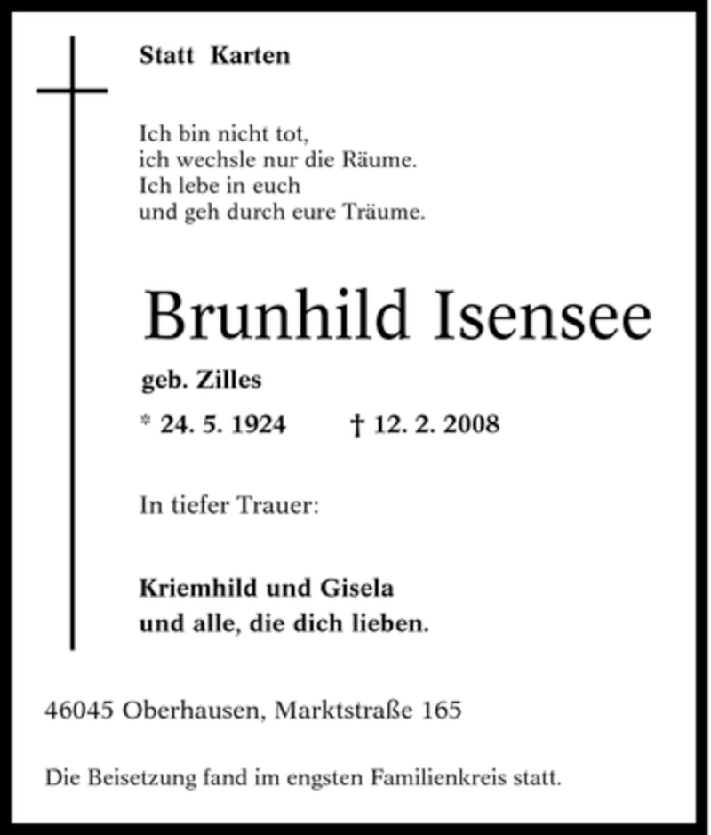 Hier finden Sie alle Traueranzeigen aus der Zeitung, die bisher für Brunhild Isensee erschienen sind. Weitere Traueranzeigen, die in der Zeitung erscheinen, werden hier ebenfalls aufgelistet