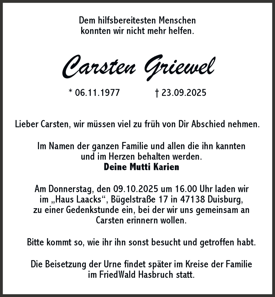 Hier finden Sie alle Traueranzeigen aus der Zeitung, die bisher für Carsten Griewel erschienen sind. Weitere Traueranzeigen, die in der Zeitung erscheinen, werden hier ebenfalls aufgelistet
