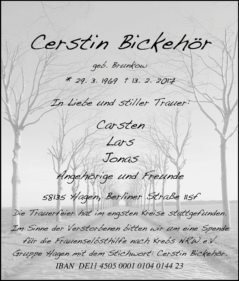 Hier finden Sie alle Traueranzeigen aus der Zeitung, die bisher für Cerstin Bickehör erschienen sind. Weitere Traueranzeigen, die in der Zeitung erscheinen, werden hier ebenfalls aufgelistet
