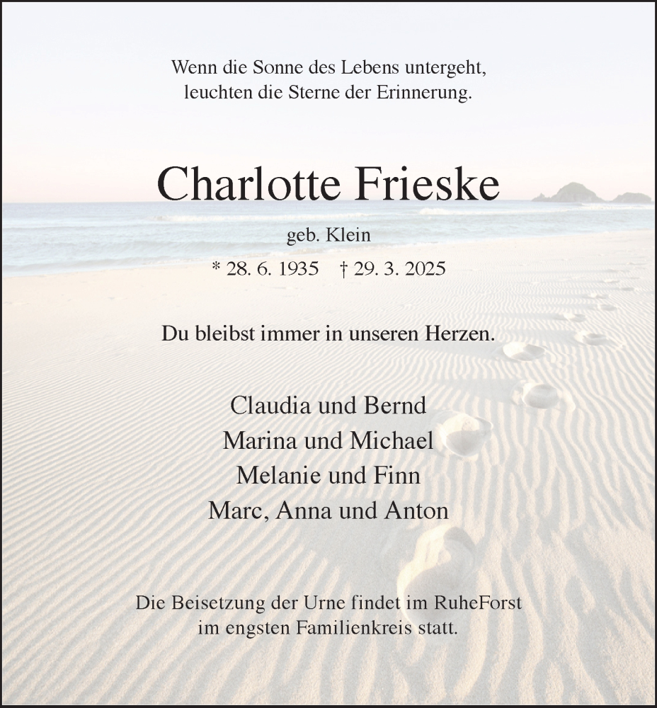 Hier finden Sie alle Traueranzeigen aus der Zeitung, die bisher für Charlotte Frieske erschienen sind. Weitere Traueranzeigen, die in der Zeitung erscheinen, werden hier ebenfalls aufgelistet