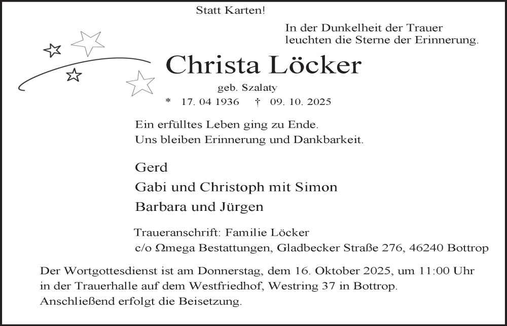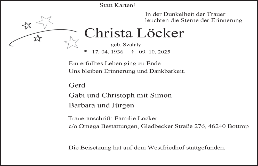 Hier finden Sie alle Traueranzeigen aus der Zeitung, die bisher für Christa Löcker erschienen sind. Weitere Traueranzeigen, die in der Zeitung erscheinen, werden hier ebenfalls aufgelistet