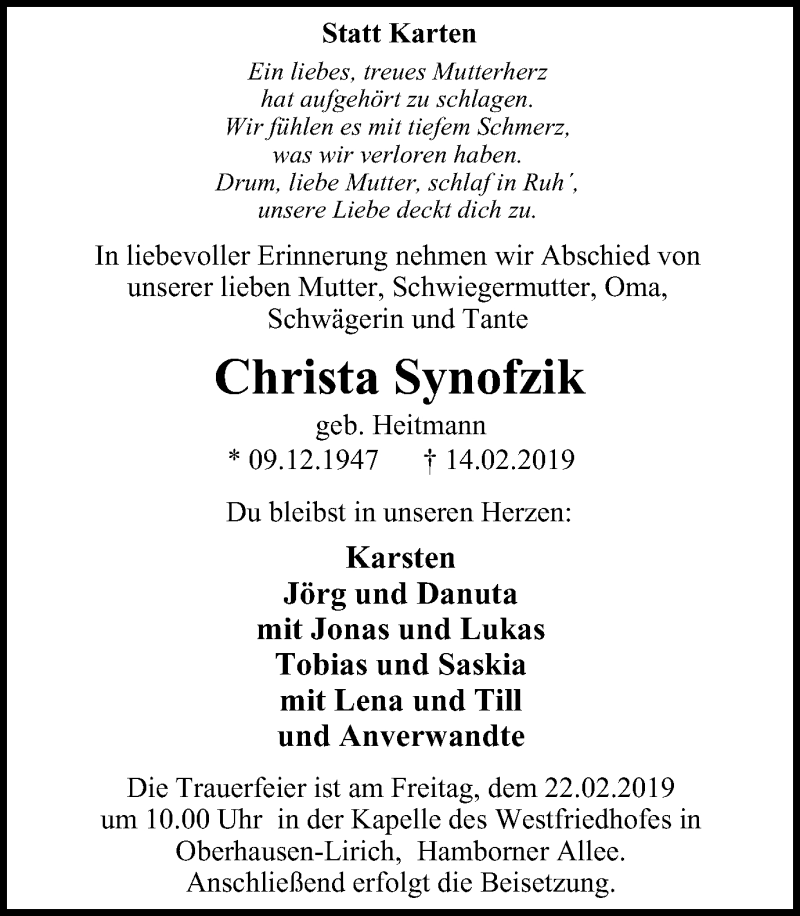 Hier finden Sie alle Traueranzeigen aus der Zeitung, die bisher für Christa Synofzik erschienen sind. Weitere Traueranzeigen, die in der Zeitung erscheinen, werden hier ebenfalls aufgelistet