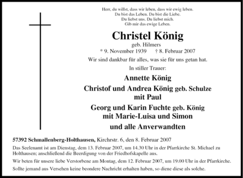Hier finden Sie alle Traueranzeigen aus der Zeitung, die bisher für Christel König erschienen sind. Weitere Traueranzeigen, die in der Zeitung erscheinen, werden hier ebenfalls aufgelistet