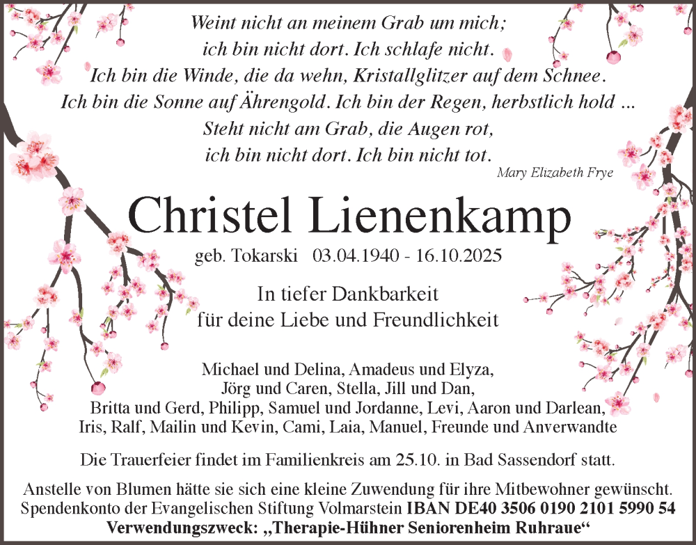 Hier finden Sie alle Traueranzeigen aus der Zeitung, die bisher für Christel Lienenkamp erschienen sind. Weitere Traueranzeigen, die in der Zeitung erscheinen, werden hier ebenfalls aufgelistet