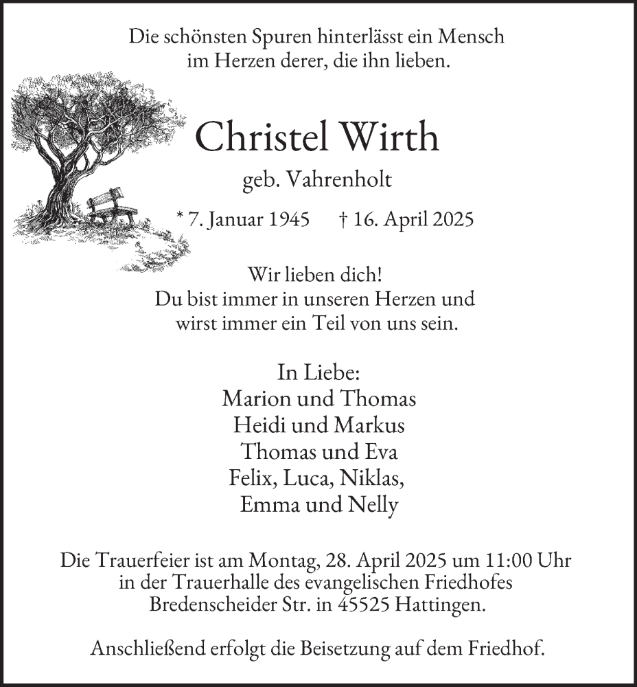 Hier finden Sie alle Traueranzeigen aus der Zeitung, die bisher für Christel Wirth erschienen sind. Weitere Traueranzeigen, die in der Zeitung erscheinen, werden hier ebenfalls aufgelistet