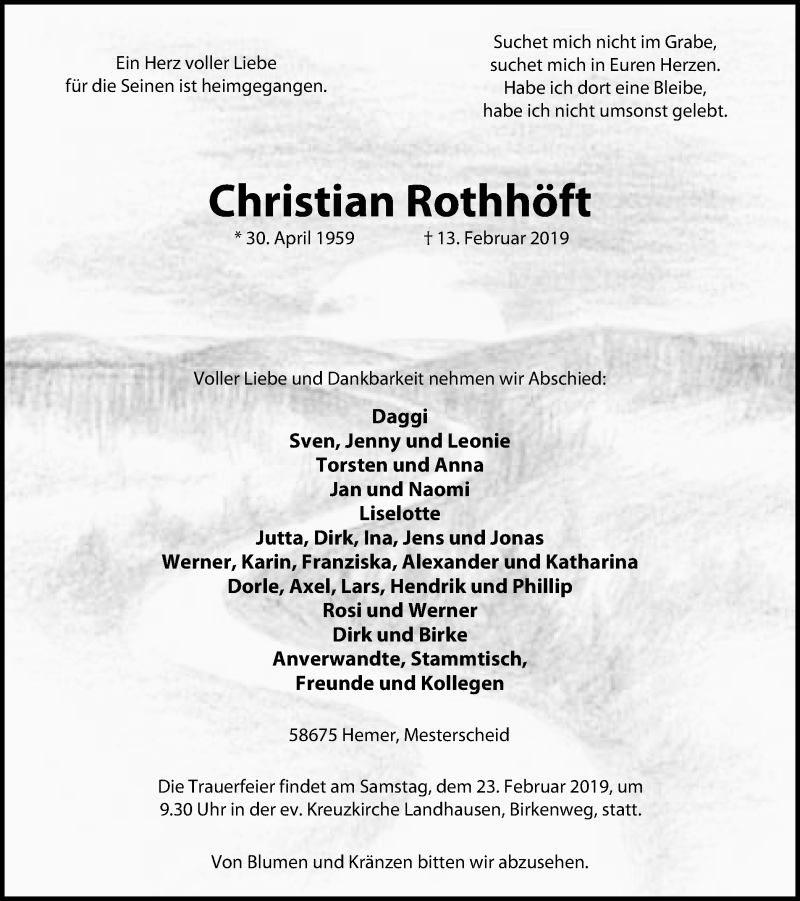 Hier finden Sie alle Traueranzeigen aus der Zeitung, die bisher für Christian Rothhöft erschienen sind. Weitere Traueranzeigen, die in der Zeitung erscheinen, werden hier ebenfalls aufgelistet