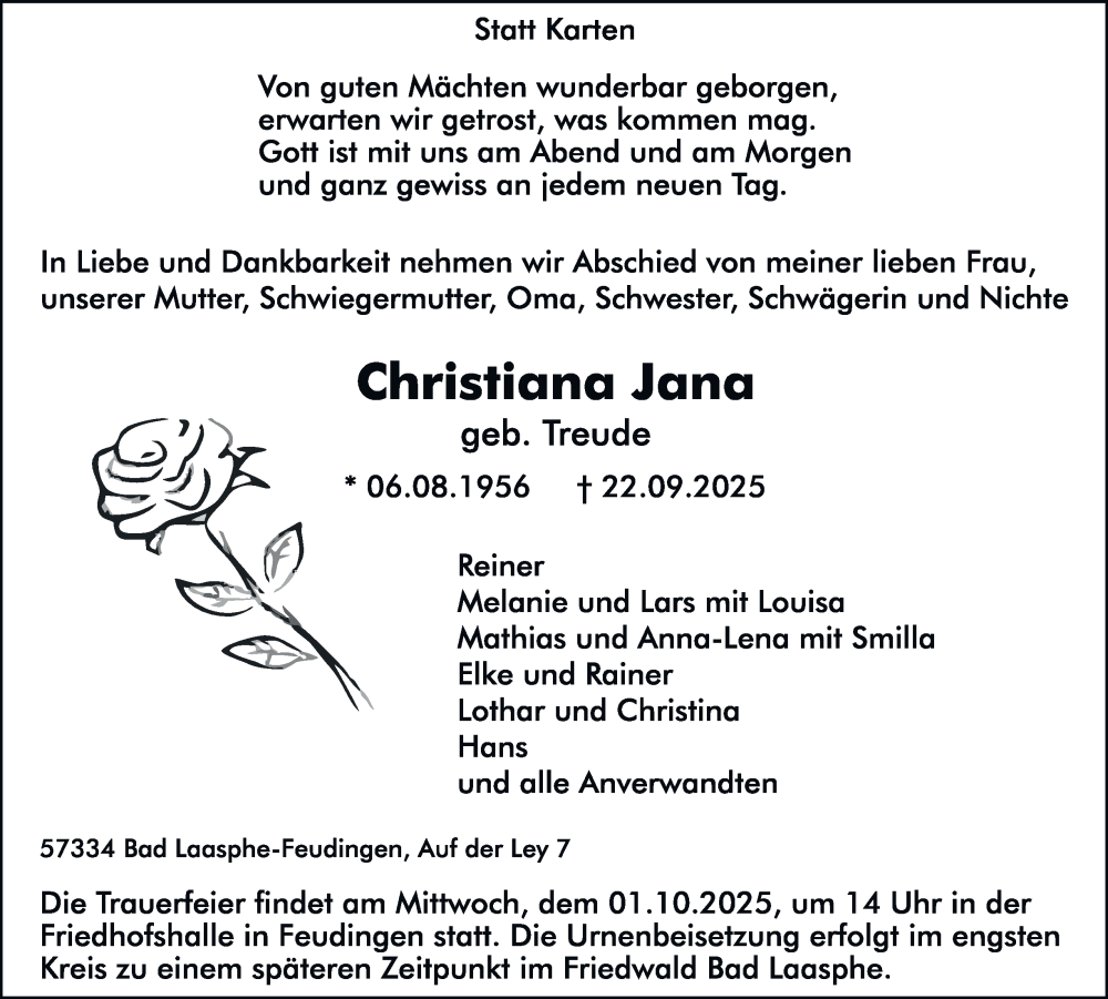Hier finden Sie alle Traueranzeigen aus der Zeitung, die bisher für Christiana Jana erschienen sind. Weitere Traueranzeigen, die in der Zeitung erscheinen, werden hier ebenfalls aufgelistet