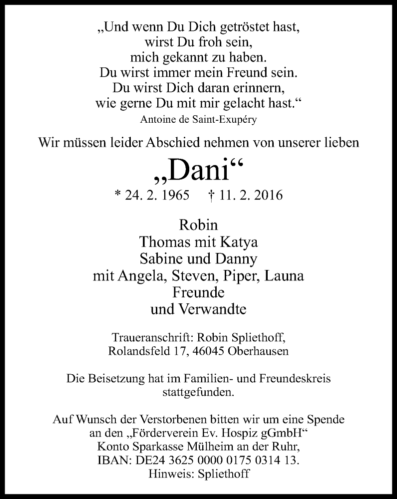 Hier finden Sie alle Traueranzeigen aus der Zeitung, die bisher für Dani erschienen sind. Weitere Traueranzeigen, die in der Zeitung erscheinen, werden hier ebenfalls aufgelistet