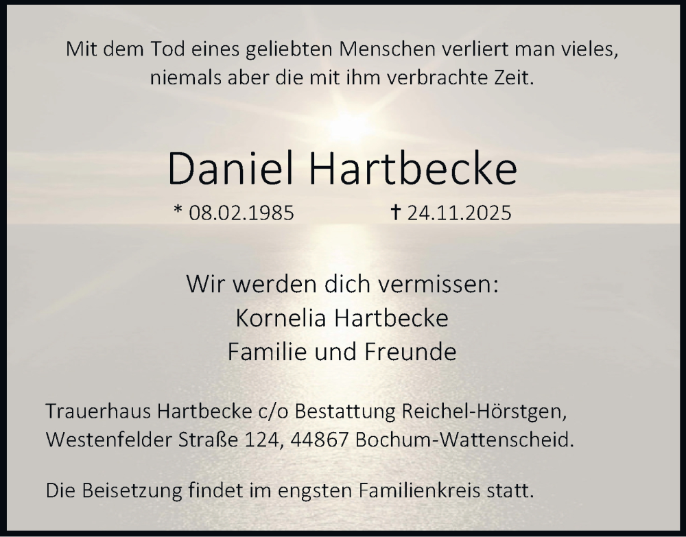 Hier finden Sie alle Traueranzeigen aus der Zeitung, die bisher für Daniel Hartbecke erschienen sind. Weitere Traueranzeigen, die in der Zeitung erscheinen, werden hier ebenfalls aufgelistet