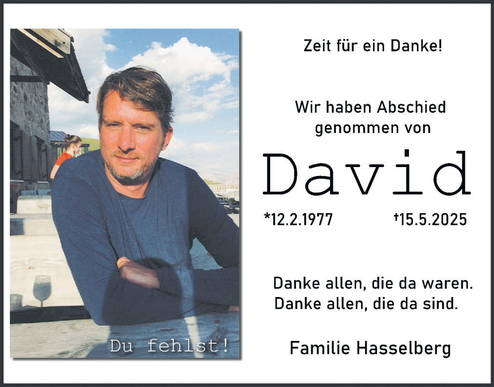 Hier finden Sie alle Traueranzeigen aus der Zeitung, die bisher für David Hasselberg erschienen sind. Weitere Traueranzeigen, die in der Zeitung erscheinen, werden hier ebenfalls aufgelistet