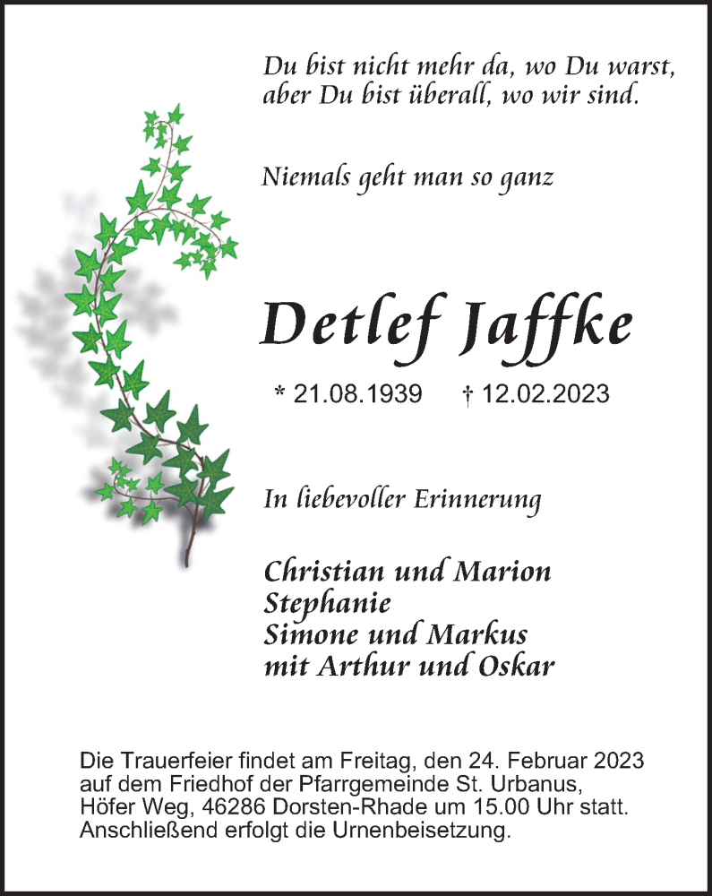 Hier finden Sie alle Traueranzeigen aus der Zeitung, die bisher für Detlef Jaffke erschienen sind. Weitere Traueranzeigen, die in der Zeitung erscheinen, werden hier ebenfalls aufgelistet