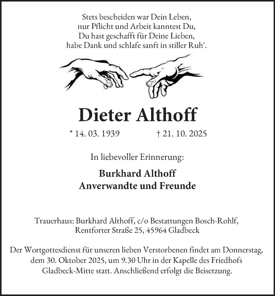 Hier finden Sie alle Traueranzeigen aus der Zeitung, die bisher für Dieter Althoff erschienen sind. Weitere Traueranzeigen, die in der Zeitung erscheinen, werden hier ebenfalls aufgelistet