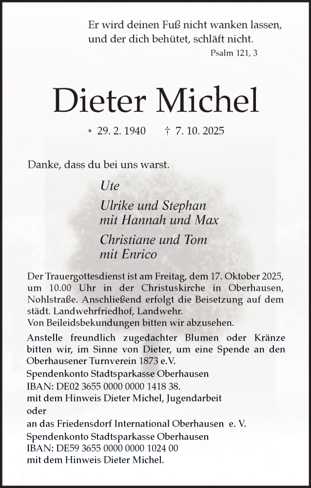 Hier finden Sie alle Traueranzeigen aus der Zeitung, die bisher für Dieter Michel erschienen sind. Weitere Traueranzeigen, die in der Zeitung erscheinen, werden hier ebenfalls aufgelistet
