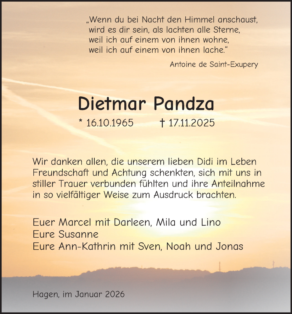 Hier finden Sie alle Traueranzeigen aus der Zeitung, die bisher für Dietmar Pandza erschienen sind. Weitere Traueranzeigen, die in der Zeitung erscheinen, werden hier ebenfalls aufgelistet