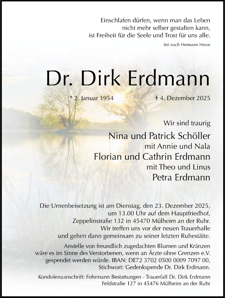 Hier finden Sie alle Traueranzeigen aus der Zeitung, die bisher für Dirk Erdmann erschienen sind. Weitere Traueranzeigen, die in der Zeitung erscheinen, werden hier ebenfalls aufgelistet