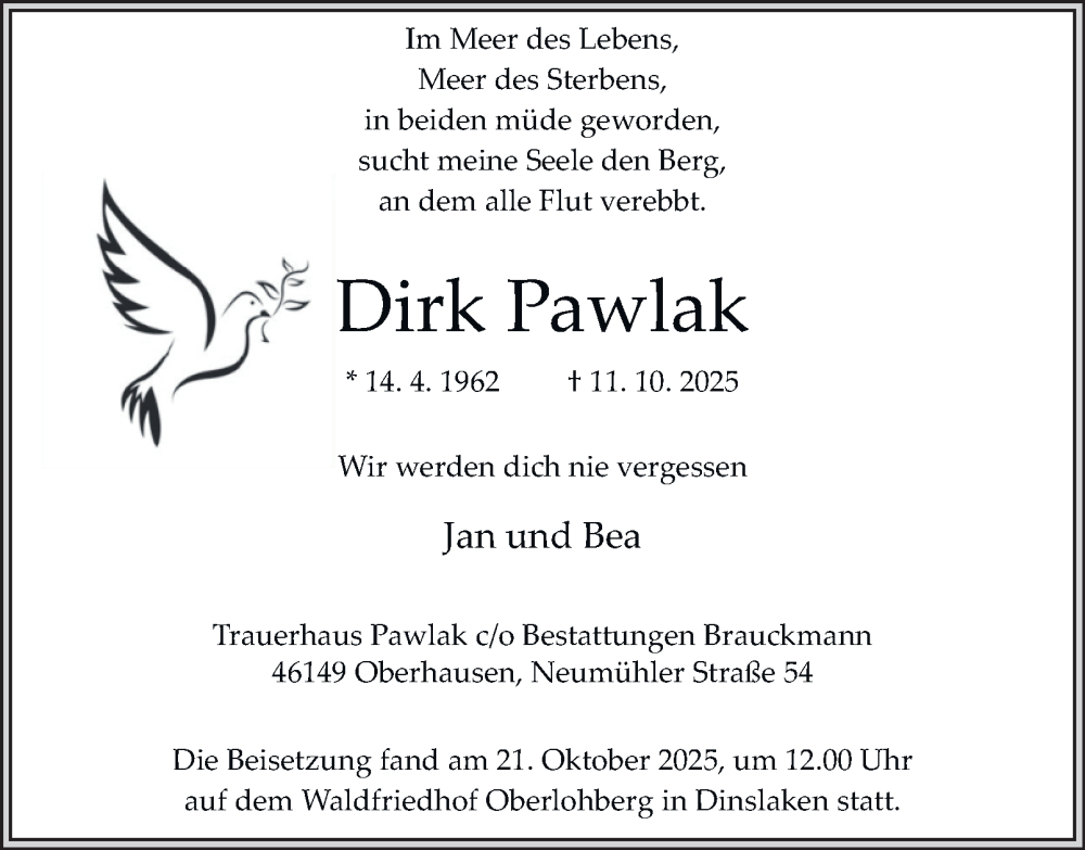 Hier finden Sie alle Traueranzeigen aus der Zeitung, die bisher für Dirk Pawlak erschienen sind. Weitere Traueranzeigen, die in der Zeitung erscheinen, werden hier ebenfalls aufgelistet