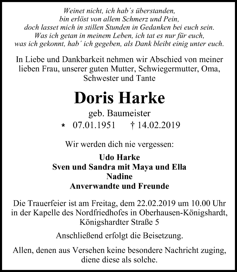 Hier finden Sie alle Traueranzeigen aus der Zeitung, die bisher für Doris Harke erschienen sind. Weitere Traueranzeigen, die in der Zeitung erscheinen, werden hier ebenfalls aufgelistet
