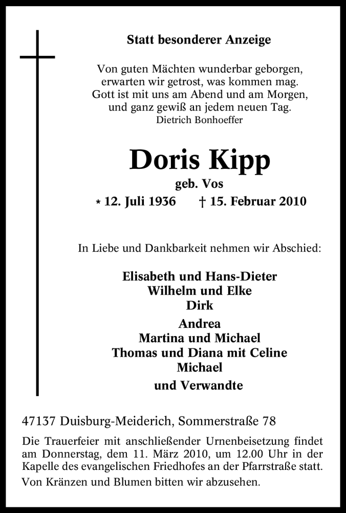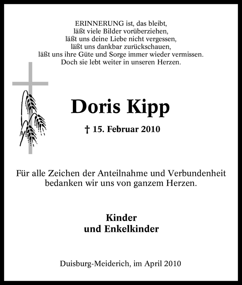 Hier finden Sie alle Traueranzeigen aus der Zeitung, die bisher für Doris Kipp erschienen sind. Weitere Traueranzeigen, die in der Zeitung erscheinen, werden hier ebenfalls aufgelistet