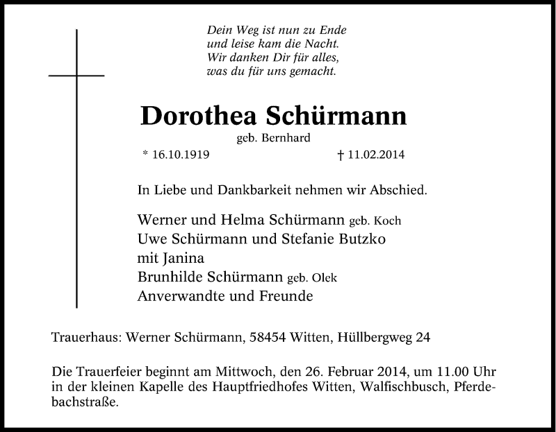 Hier finden Sie alle Traueranzeigen aus der Zeitung, die bisher für Dorothea Schürmann erschienen sind. Weitere Traueranzeigen, die in der Zeitung erscheinen, werden hier ebenfalls aufgelistet