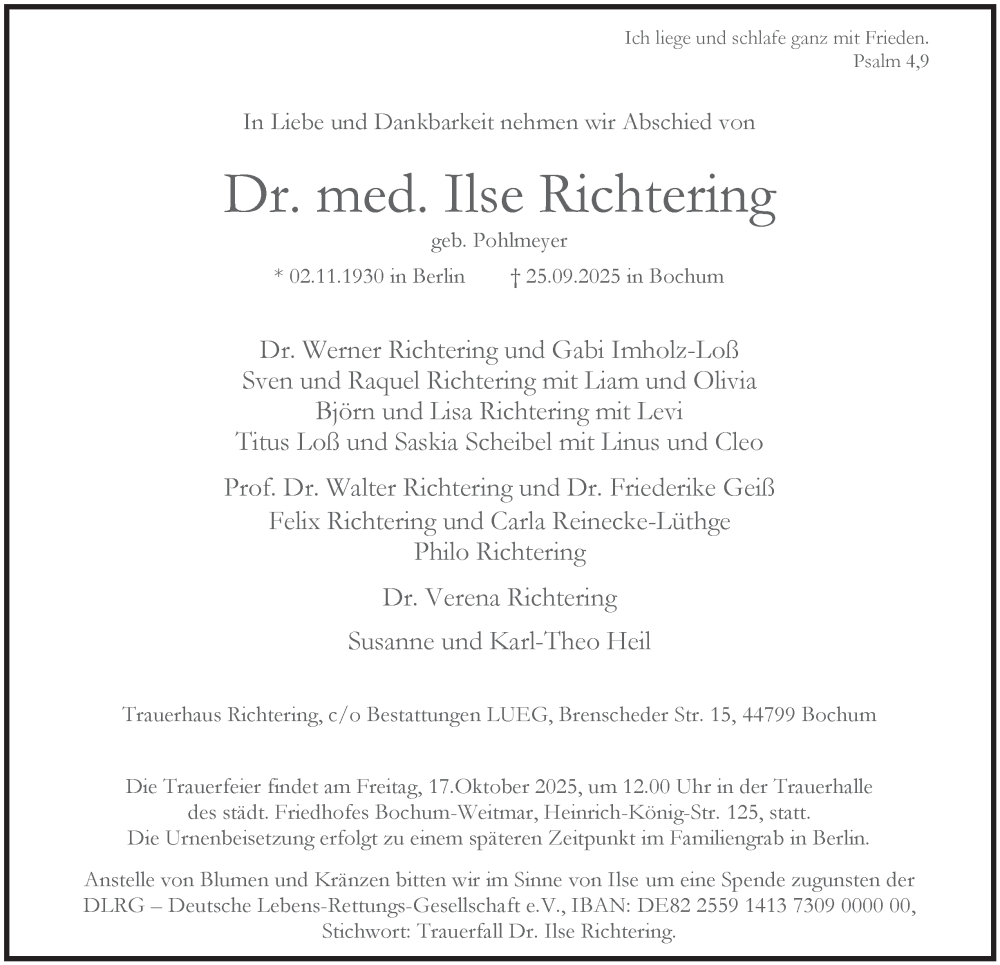 Hier finden Sie alle Traueranzeigen aus der Zeitung, die bisher für Dr. med. Ilse Richtering erschienen sind. Weitere Traueranzeigen, die in der Zeitung erscheinen, werden hier ebenfalls aufgelistet