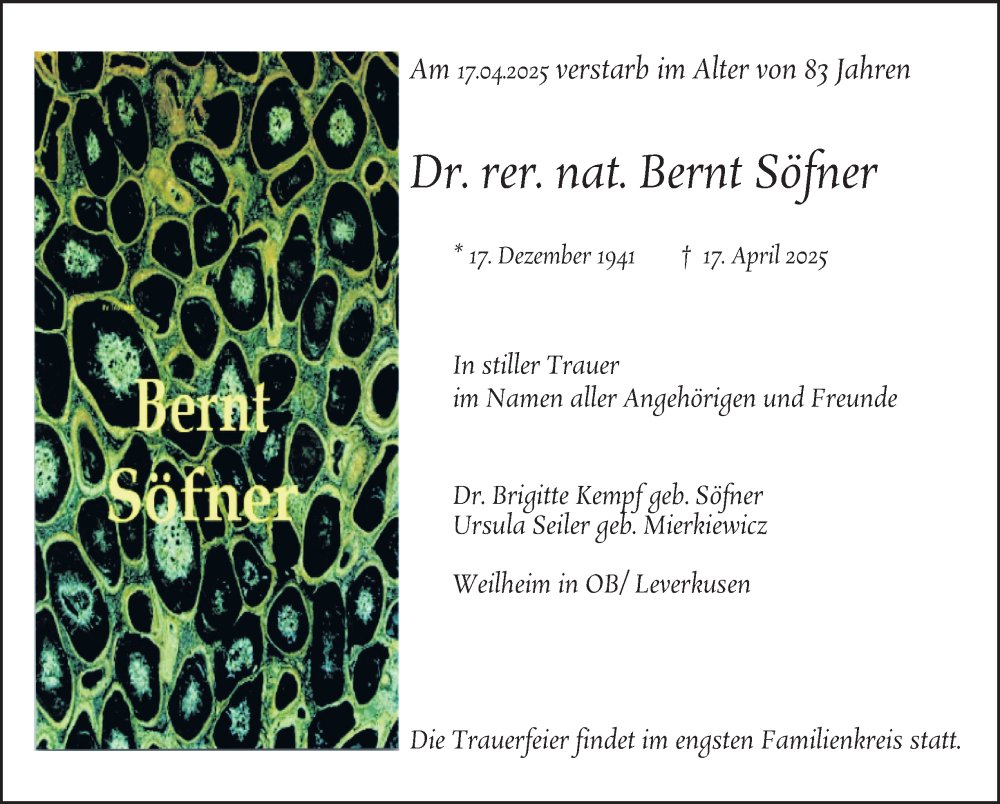 Hier finden Sie alle Traueranzeigen aus der Zeitung, die bisher für Dr. rer. nat. Bernt Söfner erschienen sind. Weitere Traueranzeigen, die in der Zeitung erscheinen, werden hier ebenfalls aufgelistet